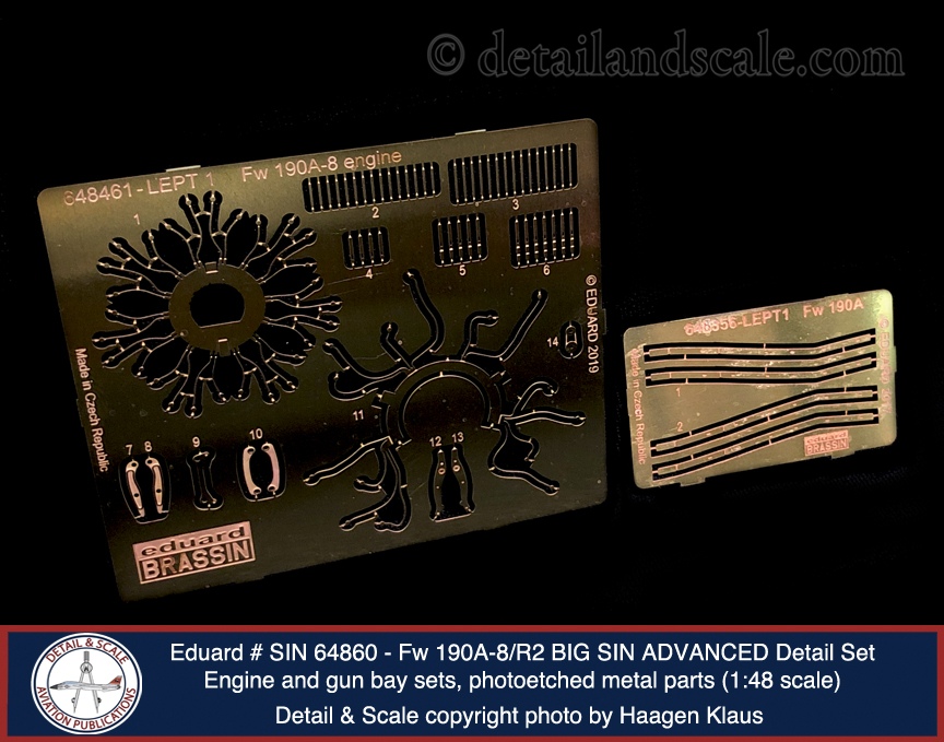 This BIG SIN set contains four individual sets: (1) #648356 Fw 190A Wing Root Gun Bays; (2) #648366 Fw 190A Propeller; (3) #648482 Fw 190A-8/R2 Engine, and (4); #48973 Fw 190A-8 Detail Set.