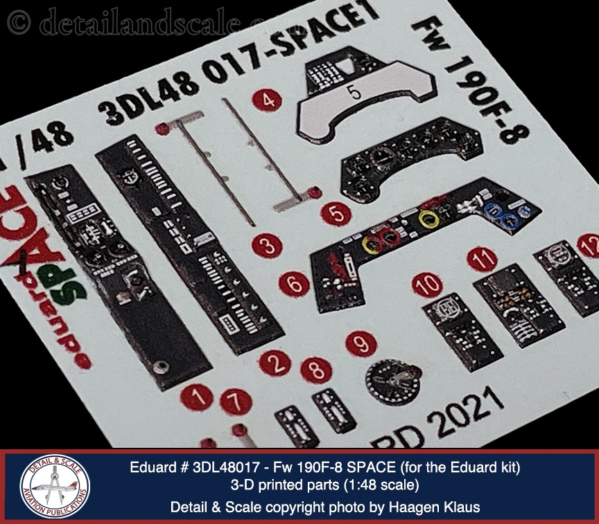 Eduard FW 190F-8 SPACE #3DL48017 (MSRP: $14.95) features fifteen 3D printed parts on a section of decal sheet and fourteen additional photoetched metal parts on a single fret. The 3D printed parts include all the elements for the pilot’s instrument panel (built up from two layers of parts), the side consoles, trim wheel, and other small details. The photoetched metal fret contains the shoulder harnesses, lap belts, trim wheel, and rudder pedals.